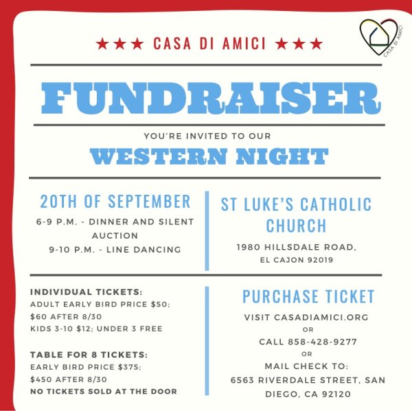 Casa di Amici annual fundraiser event is on Sept.20 at St. Luke's Catholic Church and they would like help from 2:00 to 6:00 PM and from 6:00 to 10:00 PM. They would like high school SPRITES who can help with set-up/decorating and meal prep for the first shift and while the second shift will include serving/food cleanup, entertaining younger guests, assistance with games from 6-9PM and then help demonstrate line dancing from 9 to 10:00 PM (we will have someone who can teach). I've attached our invite with more information. The theme is western so flannel shirts are welcomed.