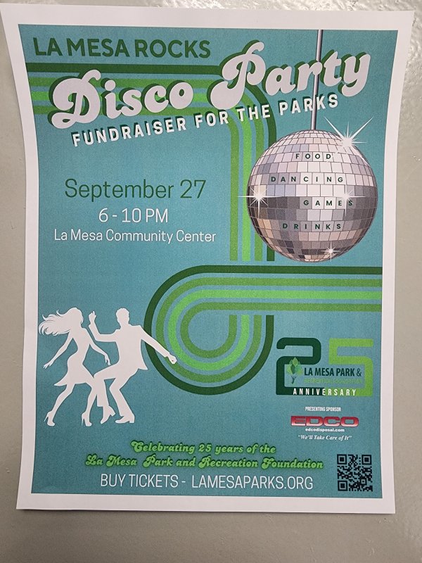 La Mesa Parks and Rec needs help with fundraising games at their annual Disco Party themed fundraiser this Saturday 9/27 from 5:30-8:30pm @ the La Mesa Community Center.